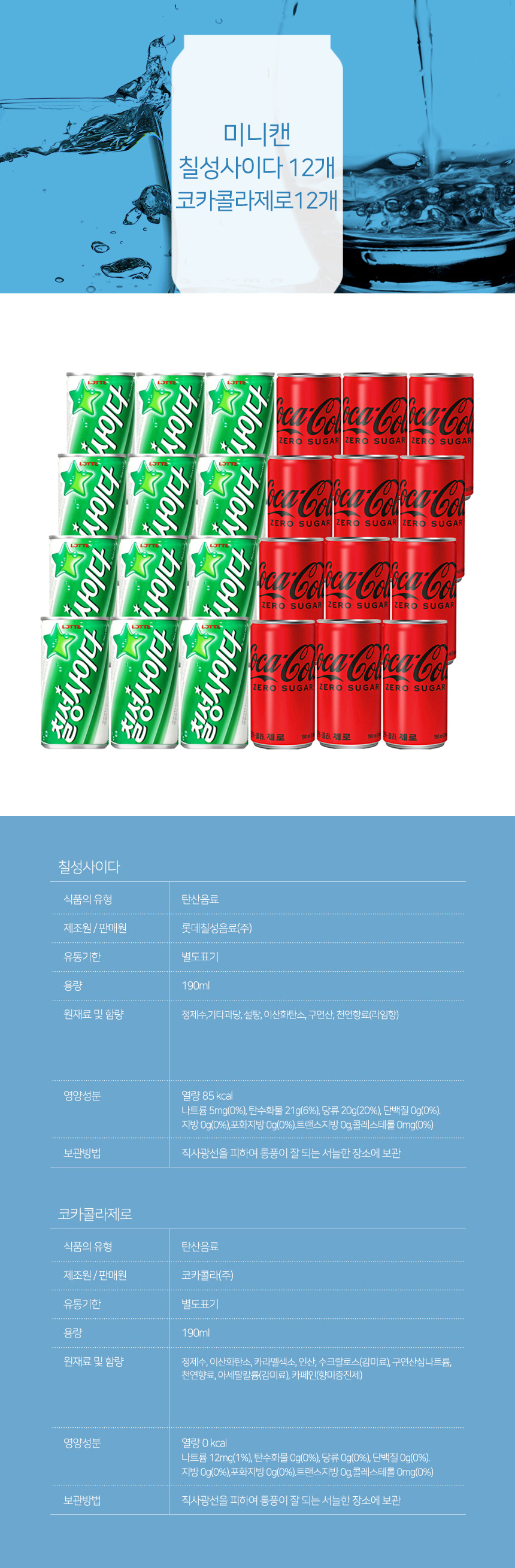 칠성사이다 + 코카콜라제로 미니캔 혼합 24개