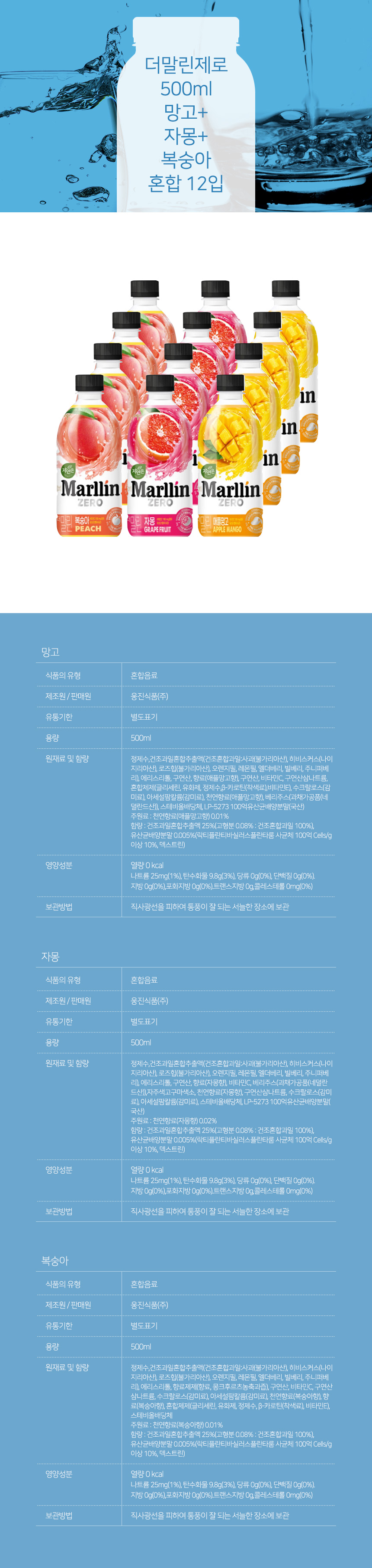 더말린제로 500ml 망고+자몽+복숭아 혼합 12입