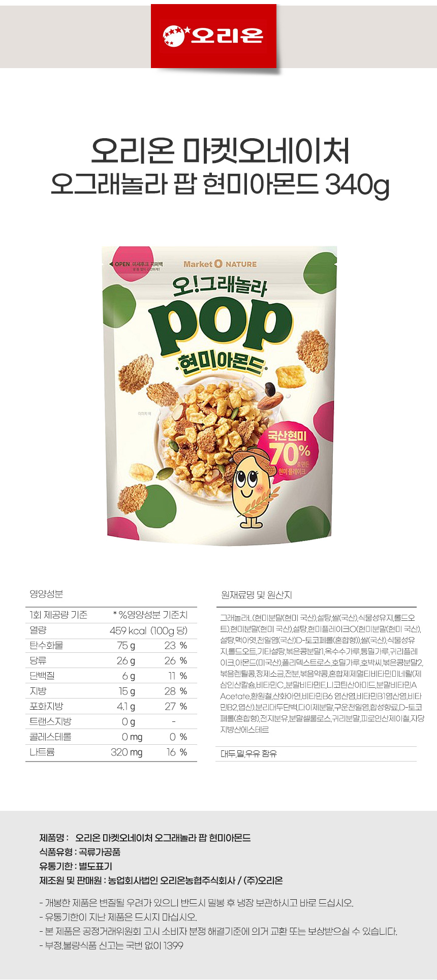 오리온 마켓오네이처 오그래놀라 팝 현미아몬드 340g