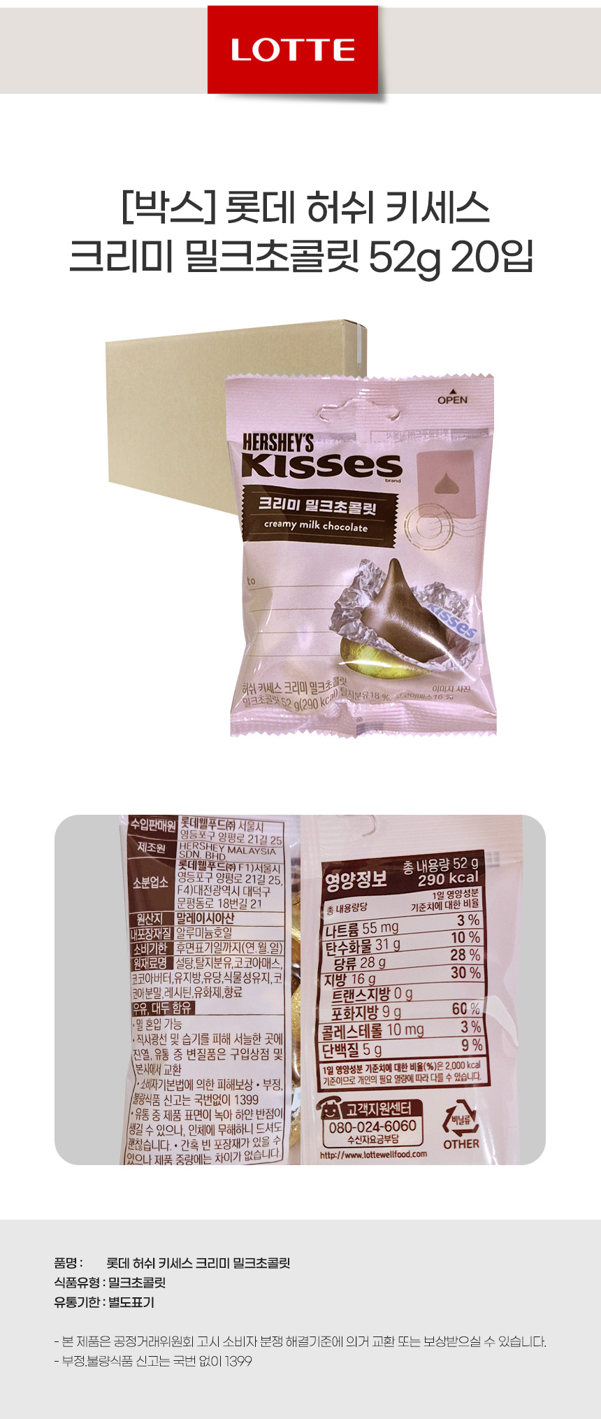 [박스] 롯데 허쉬 키세스 크리미 밀크초콜릿 52g 20입
